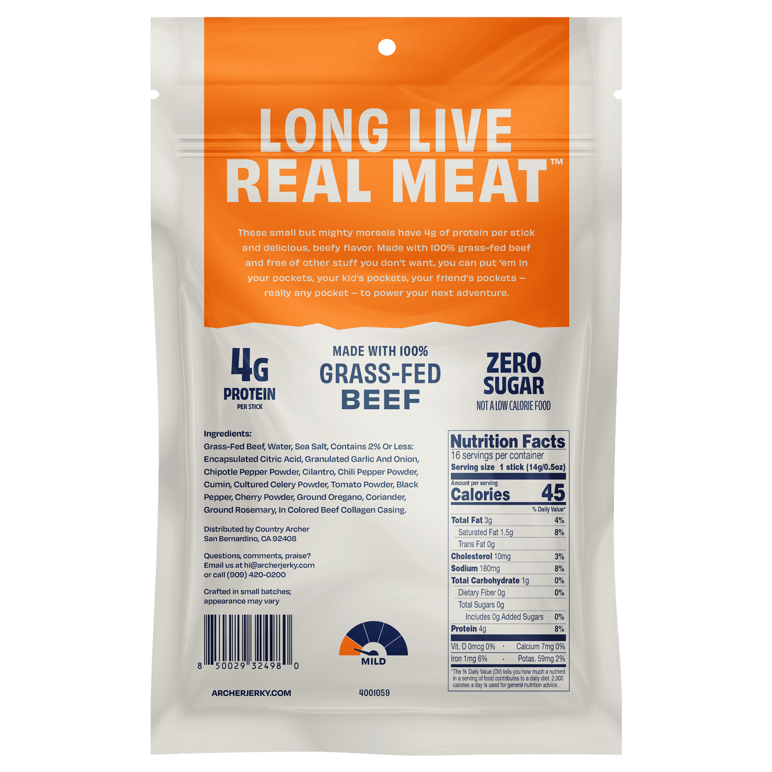 Grass-Fed Beef, Water, Sea Salt, Contains 2% Or Less: Encapsulated Citric Acid, Granulated Garlic and Onion, Chipotle Pepper Powder, Cilantro, Chili Pepper Powder, Cumin, Cultured Celery Powder, Tomato Powder, Black Pepper, Cherry Powder, Ground Oregano, Coriander, Ground Rosemary, In Colored Beef Collagen Casing.